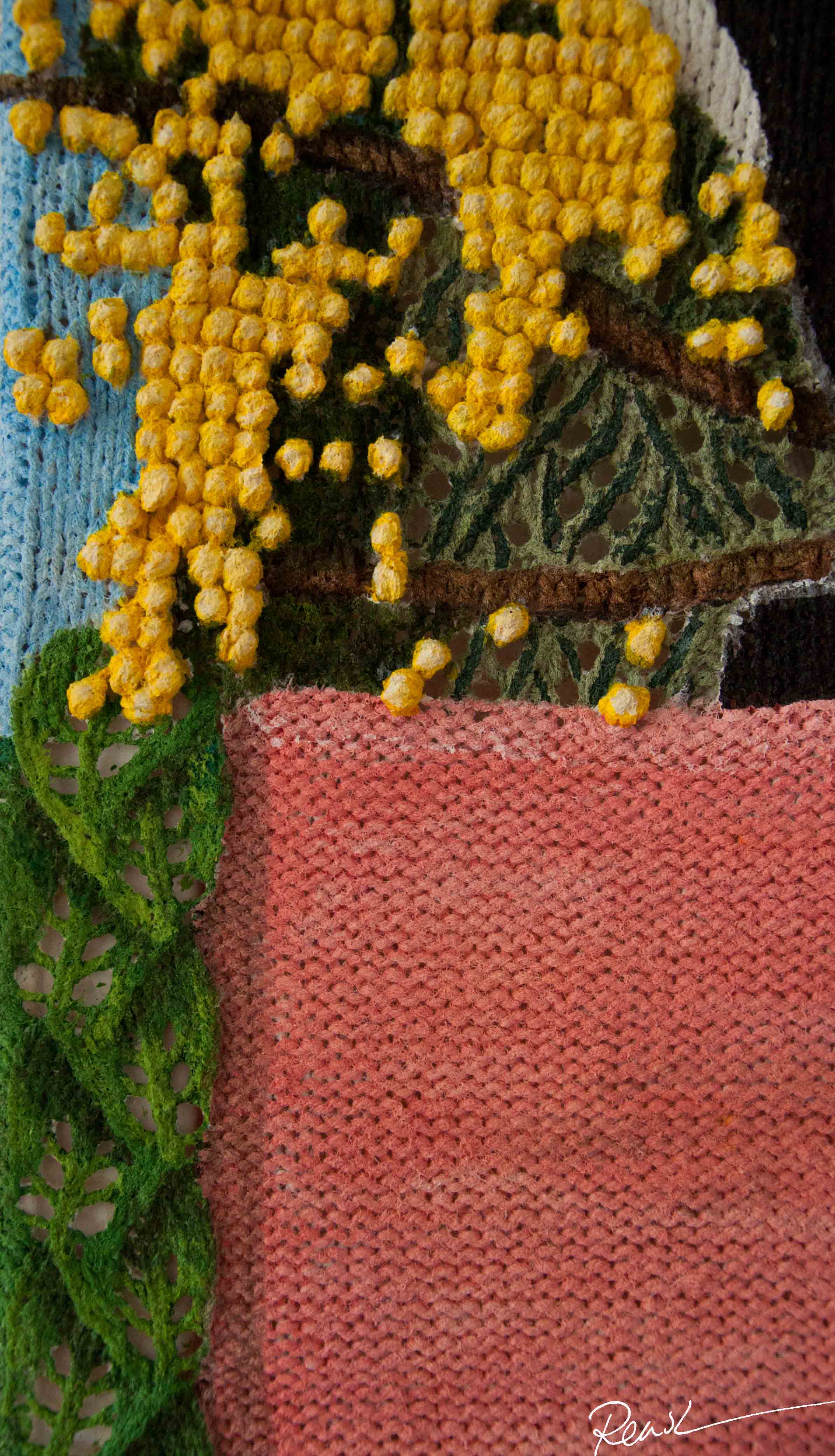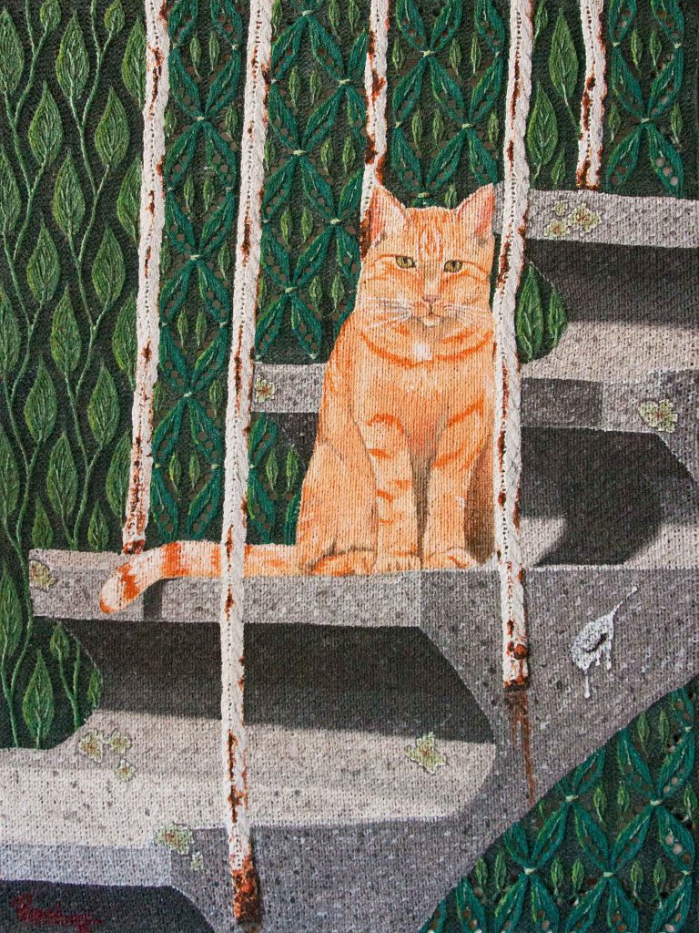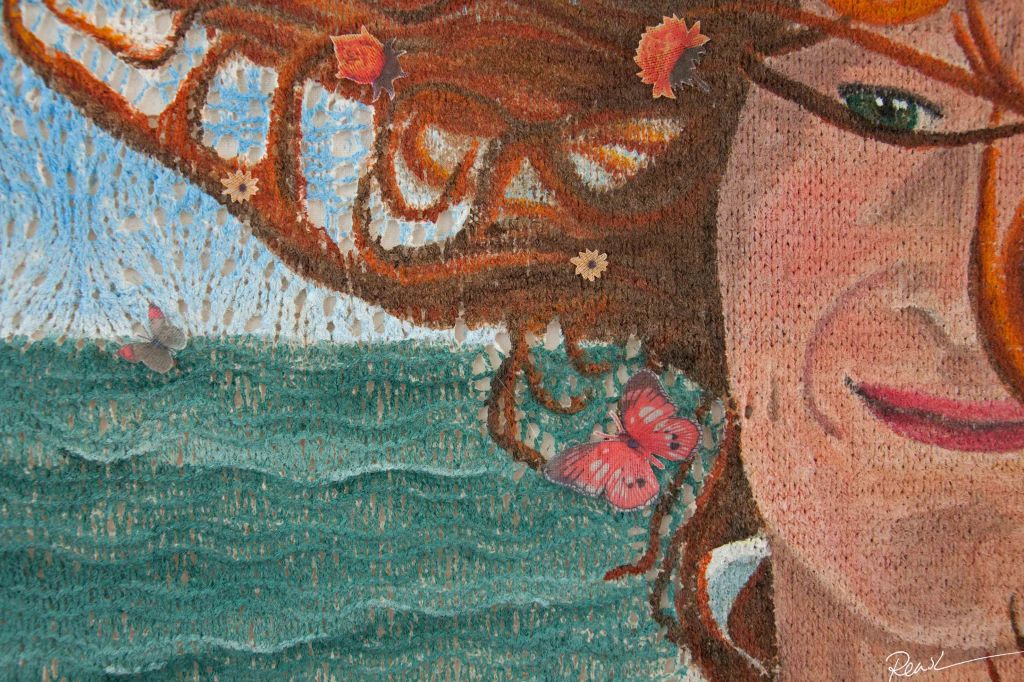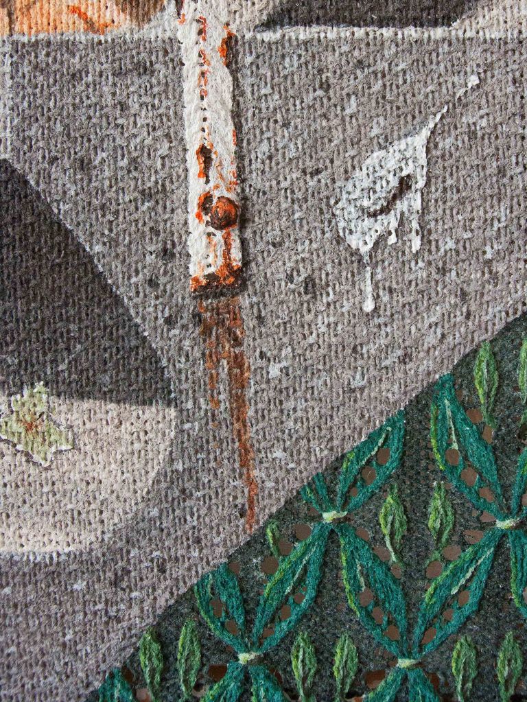 Voor de doeken van de schilderijen heb ik eerst een op maat gemaakt patroon ontworpen, vervolgens heb ik het doek gebreid en daarop met acrylverf geschilderd
