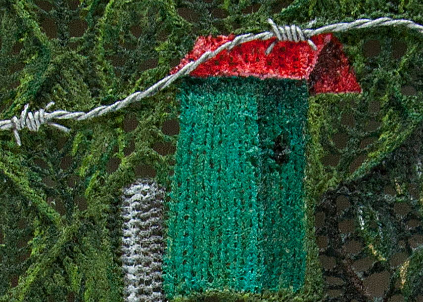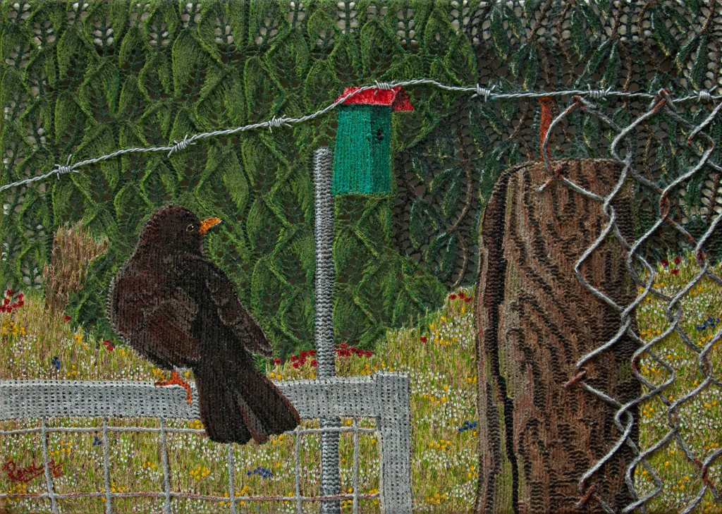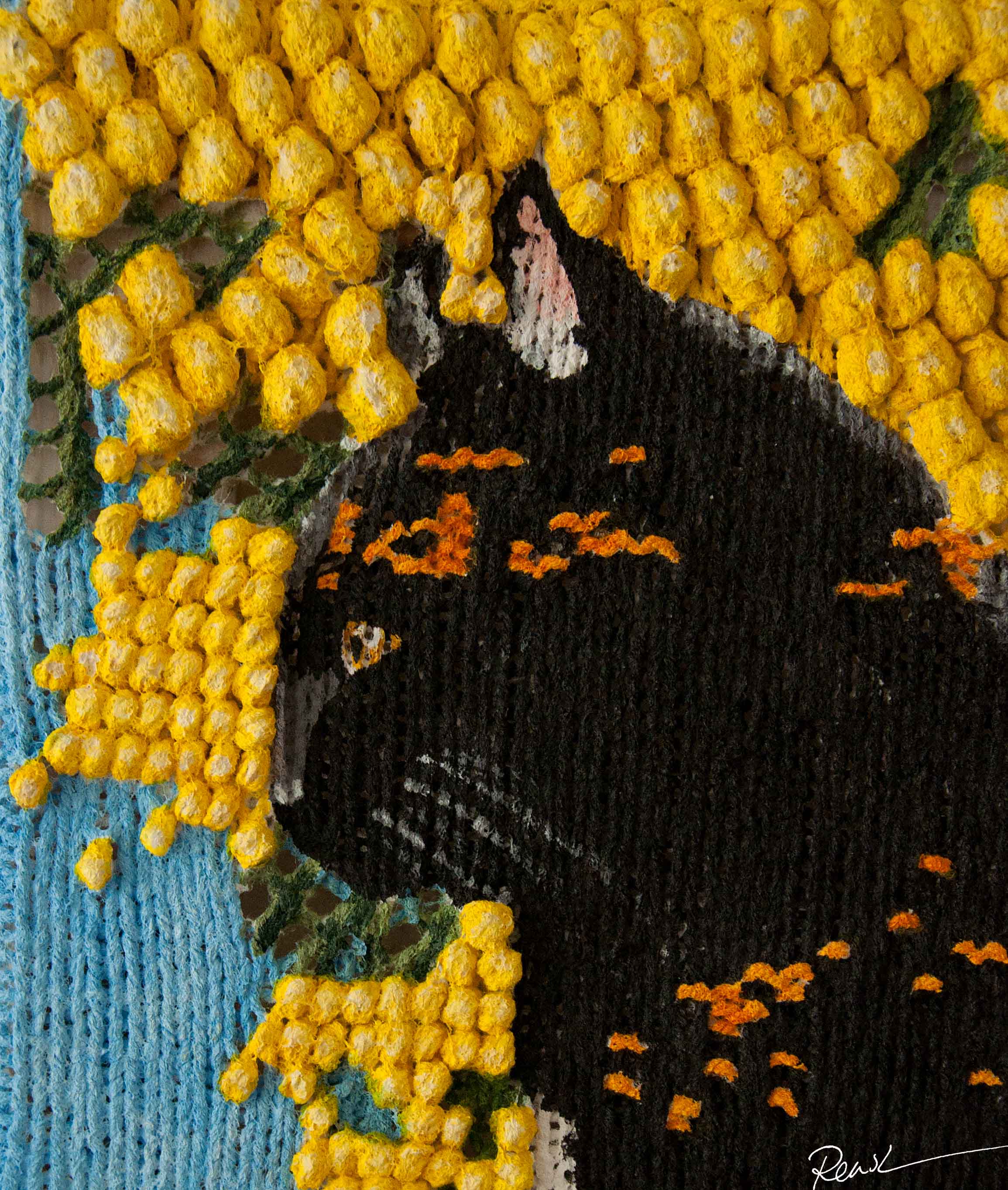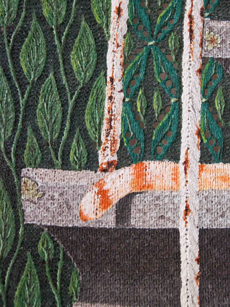 Voor de doeken van de schilderijen heb ik eerst een op maat gemaakt patroon ontworpen, vervolgens heb ik het doek gebreid en daarop met acrylverf geschilderd